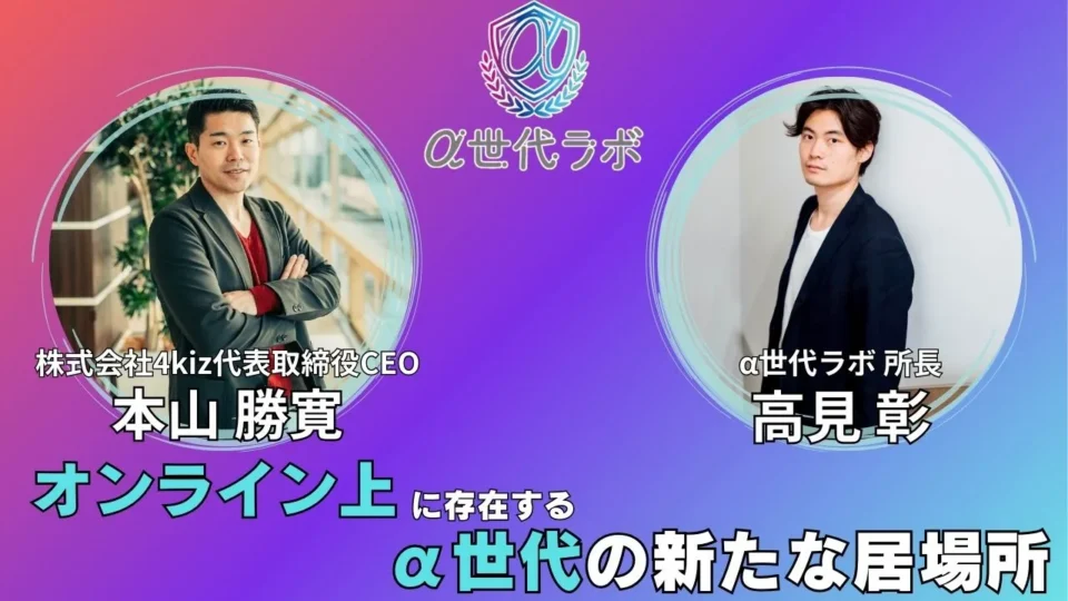 「α世代と社会・企業をつなぐ」をコンセプトに活動するマーケティング組織「α世代ラボ」の公式サイトに、α世代ラボ所長の高見彰氏と株式会社4kiz代表取締役CEO本山勝寛との対談記事が掲載されました。